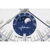 「月」、「日」、「曜日」、さらに「ムーンフェイズ」も表示し、シンプルでエレガントな機能美を併せ持ったドレスウォッチ