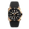 60分メモリを備えた逆回転防止ベゼルはブロンズ製で、ホワイトのスーパーミノルバ®X1(グリーン発光)マーキングとポリッシュ仕上げのブラックセラミック製インサートを組み合わせています。