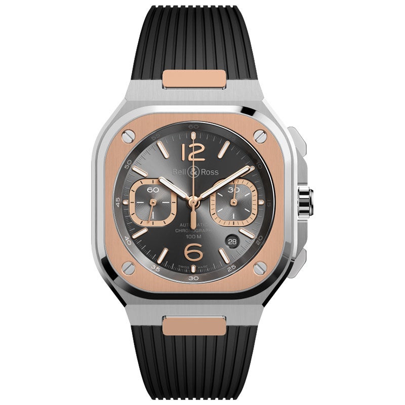 BR 05 CHRONO GREY STEEL & GOLD 41 MM 丁寧な仕上げが施された個性的なインスツルメント、BR 05 クロノグラフは、Bell & Ross の彫刻作品を思わせる力強い男性的な宝飾品です。 【製品スペック】 ■ムーブメント キャリバー BR-CAL.326。 自動巻き。パワーリザーブ 60 時間。 ■機能 時、分、スモールセコンド、9 時位置に日付。クロノ ■ケース 幅 42 mm、厚さ 14.25 mm。サテン/ポリッシュ仕上げステンレススティールおよび 18K ピンクゴールド。ねじ込み式リューズ。リューズガード。360 度回転するローター付きサファイアクリスタル ケースバック。 ■文字盤 ルテニウム サンレイ仕上げ。ホワイトのスーパールミノバ® コーティング(グリーンの輝き)が施されたピンクゴールドメッキのアプライド インデックスと数字。ホワイトのスーパールミノバ® コーティング(グリーンの輝き)が施されたスケルトンの 18K ピンクゴールド製時/分針。 ■カバーガラス 反射防止サファイアクリスタル。 ■防水性 100 m。 ■ストラップ ラバーストラップ。ステンレススチールと18Kローズゴールドのツートンカラーのブレスレット。 ■バックル フォールディング。サテン/ポリッシュ仕上げステンレススティール。 ※当店では、限定品や希少性の高い商品につきまして、より多くのお客様にお求めいただけるよう 販売数量を制限させていただく場合がございます。 何卒ご理解賜りますようお願い申し上げます。