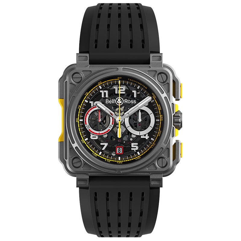 BR-CAL.313. 自動巻き。X 型のアッパー ブリッジ。56 石、28,800 振動/時。スケルトン加工済みクロノグラフ。