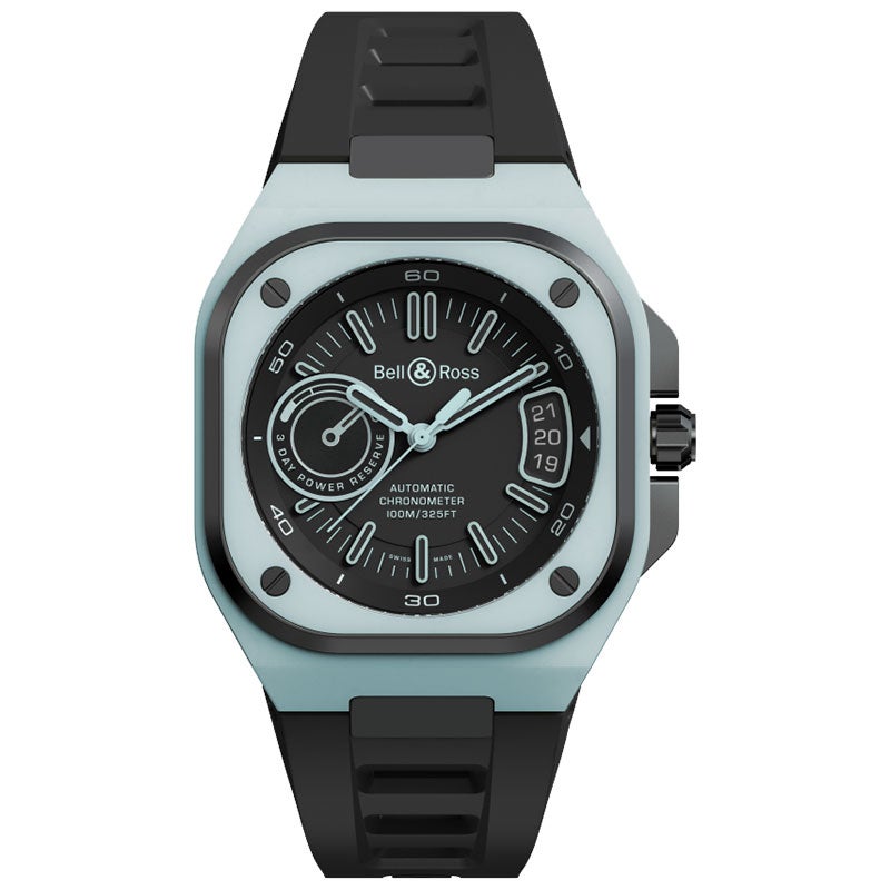 BRX5R-BLUM-TC/SRBは、ベル&ロスの掲げるデザイン哲学「視認性、機能性、高精度、信頼性」を極限まで追求したハイエンドライン「BR-X5」から登場した、世界限定500本の特別なモデルです。最大の特徴は、ケースの上下インサートとベゼルインサートに、発光複合素材である「ブルー夜光付きクォーツファイバー」を採用した点です。暗闇でケース全体が鮮烈なブルーの輝きを放ち、他に類を見ない独創的な視認性を実現しています。