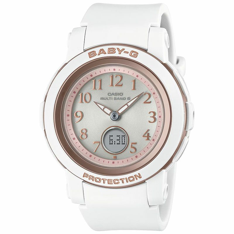 アクティブな女性のためのカジュアルウオッチBABY-Gからベーシックスタイルと相性の良いコンパクトな電波ソーラーモデルです。