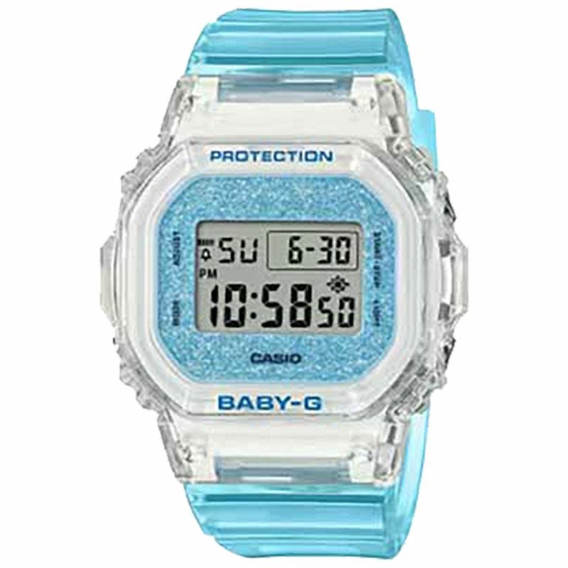 アクティブな女性に向けた耐衝撃・カジュアルウオッチBABY-Gから、キラキラ輝くグリッターダイアルとスケルトンのバンドデザインが特徴のモデルです。 ベースモデルには、コンパクトな角型フォルムが特徴のBGD-565を採用。ベゼルとバンドにはクリアカラーの透明樹脂を使用し、ダイアルにはきらめくグリッターをあしらい、華やかさをプラスしました。 耐衝撃構造や10気圧防水機能など、日常のアクティブシーンに欠かせない頼れる機能も充実。日常生活はもちろん、スポーツやレジャーシーンも安心。アクティブな毎日を応援します。