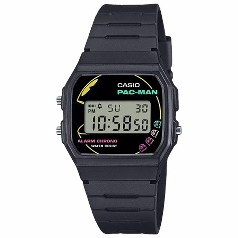 CASIO CLASSICとバンダイナムコエンターテインメントの人気ゲーム、「PAC-MAN」のコラボレーションモデルです。50周年を迎えたカシオウオッチと2025年に45周年を迎えるパックマンのスペシャルコラボレーション。パックマンの世界観を遊び心満載のデザインで表現しました。 パックマンと4種類のゴースト(ブリンキー、インキー、クライド、ピンキー)を大胆にレイアウト。カラフルなネオンカラーでポップなデザインに仕上げました。遊環に、パックマンがクッキーを食べる音「WAKAWAKA」の文字をあしらい遊び心をプラス。裏蓋には、パックマンとロゴを刻印しました。バンドの樹脂素材にはバイオマスプラスチックを使用しています。ネオンカラーを施したスペシャルパッケージ付きです。
