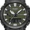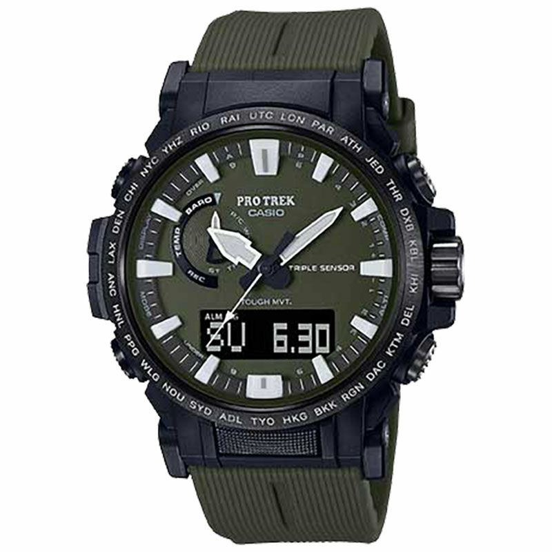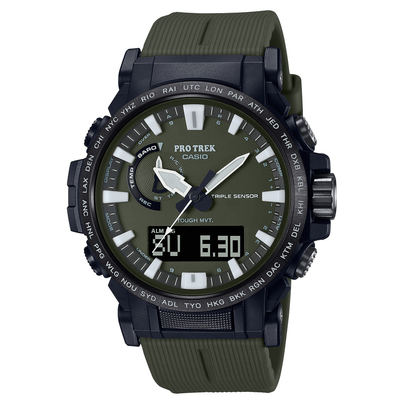 自然を愛する人の本格アウトドアギア「PRO TREK」から、環境に優しいエコ素材を外装に展開した「クライマーライン」PRW-61。腕なじみの良い装着性と高い視認性はそのままに、ケースと裏蓋にはヒマシ油、バンドにはトウモロコシを原料としたバイオマスプラスチックを使用しています。ソフトウレタンバンドにはターゲットガイドを採用し、秒針の示す方角の判読性を高め、より方位が分かりやすい機能美あるデザインで表現。また、文字板には、針を太くした見やすいバーインデックスを採用し、視認性を高めています。ベゼルはIPを施したデザインとしています。時計本来の機能として世界6局の電波を受信するマルチバンド6やタフソーラーなど実用的な機能も兼備。様々なシーンで対応する高い機能性と実用性をジャストサイズに詰め込んだモデルです。