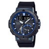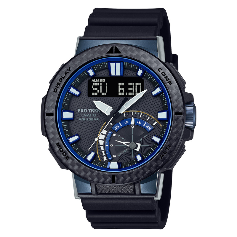 本格アウトドアギアPRO TREKの20気圧防水を搭載したアングラーラインから、釣りのツールにインスパイアされたカーボンベゼル搭載のPRW-73です。折り目模様の積層カーボンベゼルは、軽量で耐摩耗性を持ち、フィッシングでのハードな使用に耐える仕様となっています。また、文字板には波をイメージした透明印刷パターンを配しました。釣りのスピニングリールをイメージした質感高いブルーを傷に強いサファイアガラス外周に蒸着処理にて表現。ベゼルとりゅうず部分にはブルーIPを施し、レトログラードダイアルも金属感あるブルーで引き締め精悍なデザインとしました。また、腕との密着を防ぐ波打ちバンドにはソフトウレタンを採用。水辺のシーンでも軽快な装着性ある仕様としました。スライドレバーにも対応し、バンド交換などのメンテナンス性にも配慮。世界6局の電波を受信するマルチバンド6やタフソーラーなど実用的な機能も兼ね備えます。様々なシーンで対応する高い機能性と実用性をジャストサイズに詰め込んだモデルです。