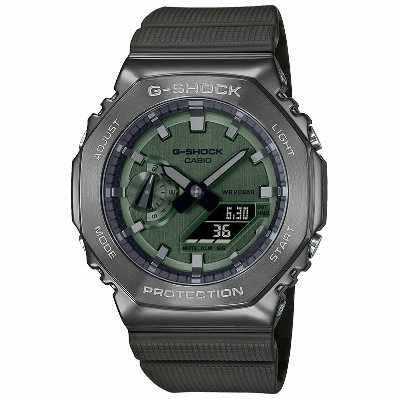 G-SHOCKの初代モデル“DW-5000C”にも採用された“八角形フォルム”を継承するGA-2100シリーズから、メタル素材を採用したモデルです。