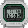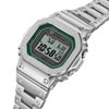 G-SHOCK GMW-B5000D-3JFは、1983年の初号機DW-5000Cのデザインを受け継ぎつつ、フルメタル化された新たな進化形です。鮮やかなグリーンのガラス蒸着が施されたフェイスが特徴的で、ステンレス製のメタルベゼルとケース間にはファインレジン緩衝体を挟んだ耐衝撃構造を採用。さらに、ディンプル加工が施されたメタルバンドピースや、スクリューバックケースが重厚感を演出します。Bluetooth通信により専用アプリと連携し、正確な時刻情報を取得可能。標準電波(マルチバンド6)による自動時刻修正や、タフソーラーによる安定駆動、高輝度のLEDバックライトなど、機能性も抜群です。