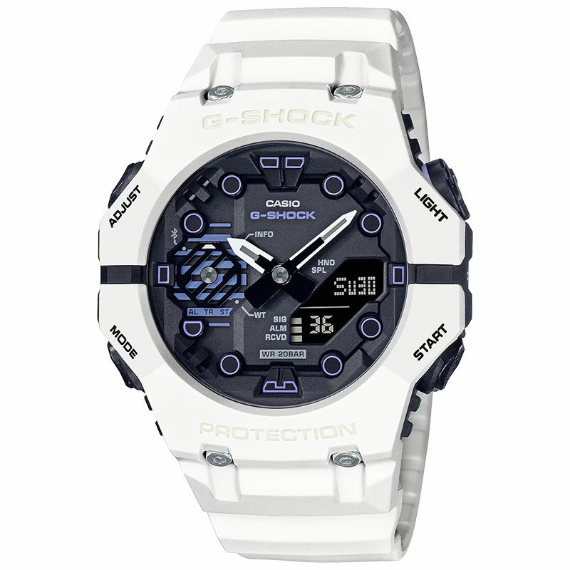 1983年の発売以来、飽くなき強さを求めて進化を続けるタフネスウオッチG-SHOCK。 近未来のテクノロジーとSFの世界観を表現したモデル、Sci-fi worldシリーズです。 ベゼルには蓄光塗料による文字埋めを施し、暗闇でG-SHOCKロゴが浮かび上がる仕様になっています。 ベースモデルはBluetooth?を搭載したバーチャルコンセプトのコンビモデルGA-B001。 スマートフォンリンクで自動時刻修正や機能設定が簡単な、ホワイトカラーが目を引く近未来的なデザインです。
