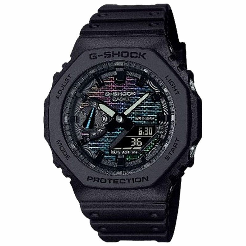1983年の発売以来、飽くなき強さを求めて進化を続けるタフネスウオッチG-SHOCKから、文字板に蒸着を施したRainbow Brick Wall seriesです。 光の反射によりさまざまな色合いを見せるレインボーカラーのグラデーション蒸着により、G-SHOCKの初号機にも使用されているレンガパターンを印刷。壁を乗り越えて常に限界を超えていくタフネススピリットを表現しました。 見る人の角度によっていろいろな表情になり、ファッションアイテムとしても活用できるクールなデザインです。