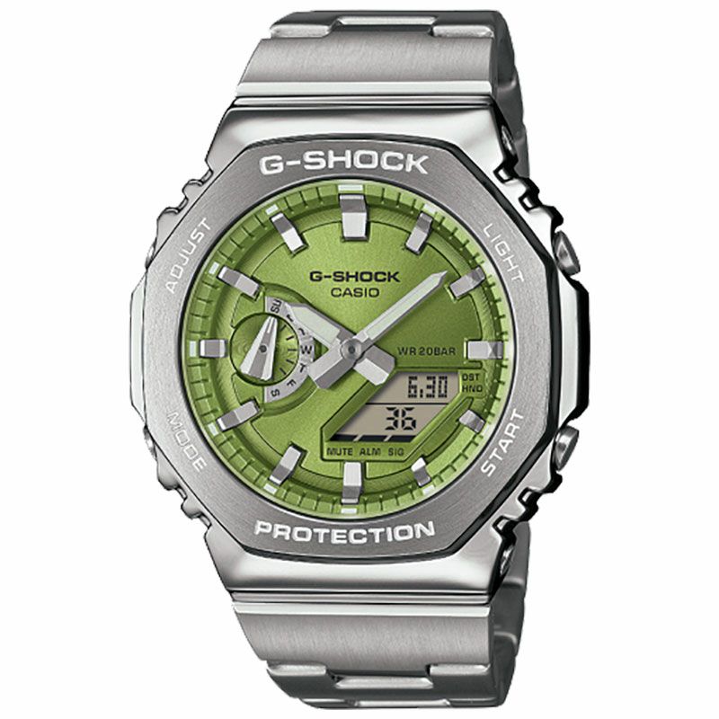 初代モデル“DW-5000C”のコンセプトを受け継ぎ、更なる薄型化を果たしたデジタル・アナログコンビネーションモデルGA-2100のベゼルとバンドを金属素材にしたGM-2110Dシリーズです。