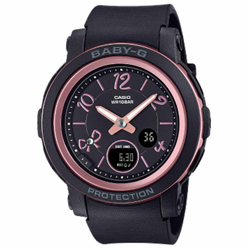 アクティブな女性のためのカジュアルウオッチBABY-Gから、フェミニンなリボンデザインを取り入れたモデルです。 ベースモデルはラウンドケースに視認性の良いワイドフェイスを組み合わせたBGA-290。 8時位置にリボンのモチーフを施し、中央にはキラキラと輝くクリスタルがアクセントとして配置されています。インデックスはリボンをイメージしたフォントでデザインし、時計全体に統一感と遊び心をプラスしました。 機能面では耐衝撃構造や着けたままで水泳もできる10気圧防水など頼れる機能を搭載しています。