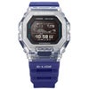 G-SHOCKのスポーツラインG-LIDEから、サマーシーズンに映えるマテリアル&カラーを纏ったモデルです。陽射しを受けて煌めく波のイメージを2つの素材を組み合わせたベゼルで表現。トップにステンレススチールパーツを使用し、斜面をミラー仕上げに。ベース部にはクリアカラーのスケルトン樹脂を採用しました。バンドの主な樹脂パーツには環境負荷低減への貢献が期待されるバイオマスプラスチックを使用しています。スマートフォンリンクを搭載し、専用のアプリケーションを介して潮汐情報や日の出/日の入時刻を世界約3300カ所から選択できます。また、ワイドフェイスで高精細な液晶を採用。タイドグラフ、ムーンデータに加え、満潮/干潮時刻、満潮/干潮の潮位、日の出/日の入時刻が表示可能です。バンドにはフィット性と水、汗逃げを考慮したスリットが入ったバイオマスプラスチックのソフトウレタンを採用し着け心地を追求しました。