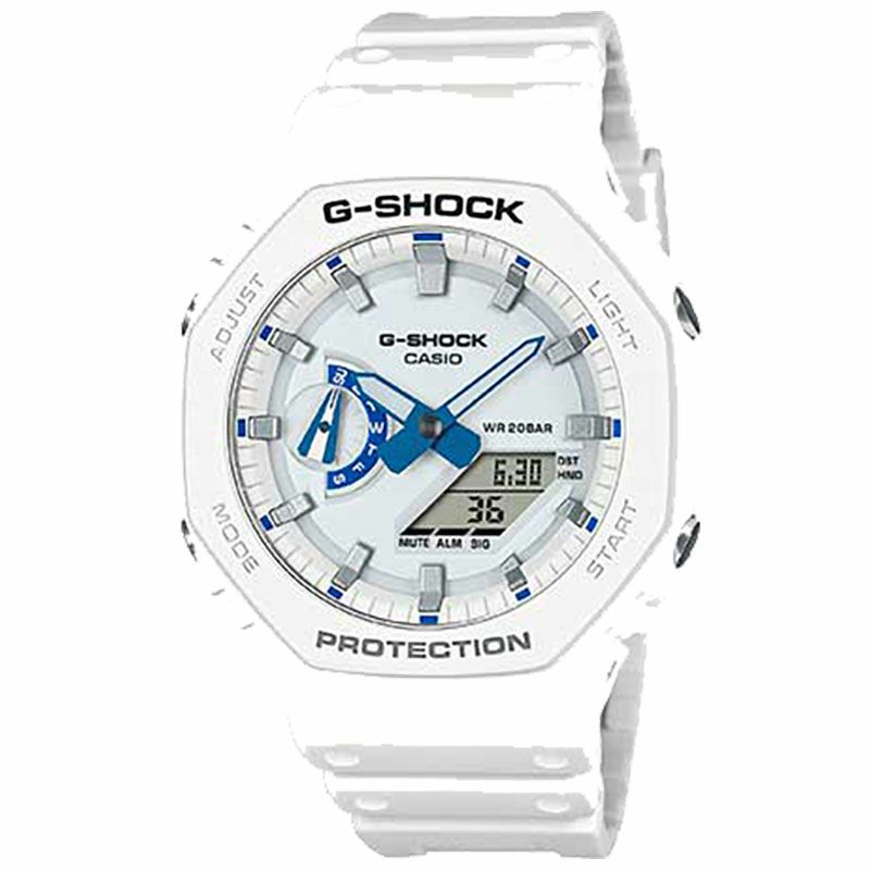 1983年の発売以来、飽くなき強さを求めて進化を続けるタフネスウオッチG-SHOCKから、人間の潜在能力を暗闇で光る蓄光パーツで表現した、HIDDEN GLOW SERIESです。夏の海をイメージしたホワイト&ブルーのカラーリング、夜光虫が放つ幻想的な光を表現したブルー蓄光フェイスを備え、昼と夜で異なる表情を見せるビーチの情景を表現しました。特徴的なダイアルデザインの個性を色と光で引き立てます。ベゼル、バンドの主な樹脂パーツにバイオマスプラスチックを使用。カジュアルスタイルからワークスタイルまでアクセントになるクールなデザインです。