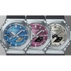 1983年の発売以来、飽くなき強さを求めて進化を続けるタフネスウオッチG-SHOCKから、2100シリーズの特徴であるスリムなサイズ感をキープしながら、スマートフォンリンクとタフソーラーを搭載したメタルベゼルのモデルです。ケース、バンドの主な樹脂パーツにはバイオマスプラスチックを採用し、環境にも配慮しました。文字板にバーガンディ蒸着、インデックスにはシルバー蒸着を施しデザイン性を高めています。カジュアルシーンからビジネスシーンまで幅広く活用できる、タフネスとデザイン性を両立したモデルです。
