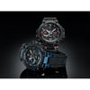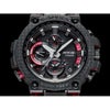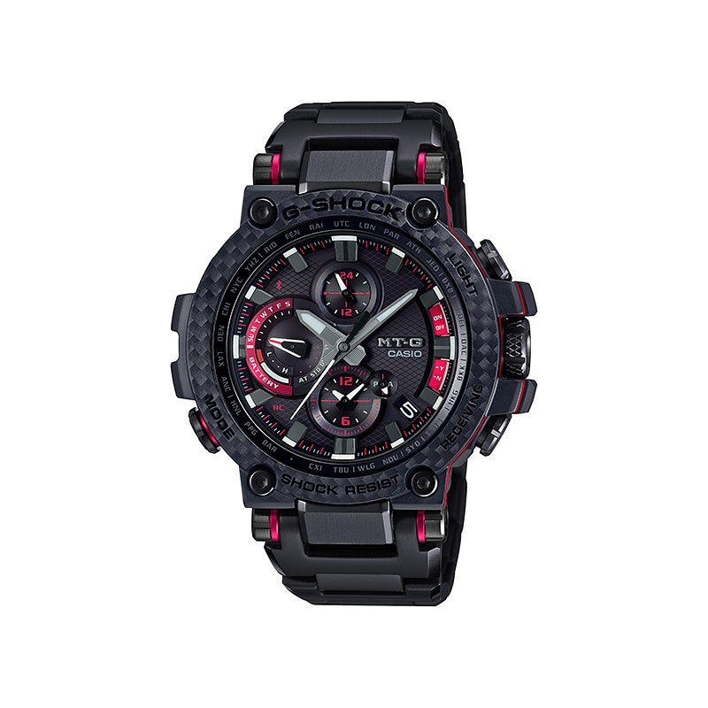 メタルと樹脂を融合した耐衝撃ボディに先進技術が搭載されたMT-Gの、カーボン素材を纏ったモデルです。バンドを接続するカン足とパイプを一体にし、モジュールを保護する「コアガード構造」を採用。センターケースにカーボンファイバー強化樹脂を用い、軽量化と耐衝撃性を実現しています。MT-Gシリーズ初のミドルサイズ化とコンポジットバンドにより装着性を高め、ケースとバンドの接続は耐振動構造としました。ベゼルには軽量かつ高剛性が特徴のカーボン素材を採用。カーボンベゼルの積層部にはアクセントカラーを配し、メタルパーツの各エッジにはミラーポリッシュ、各面にはヘアライン加工を施し美しさを追求。サファイアガラスの採用とカシオ山形工場の加工技術による繊細な彫刻が、質感を高めています。 Bluetooth?通信機能により専用アプリ「CASIO WATCHES」と接続し時刻情報を取得。また、高輝度なLEDライトやワールドタイムなどの実用的な機能を備え、これらを「タフソーラー」によって安定的に駆動できます。