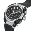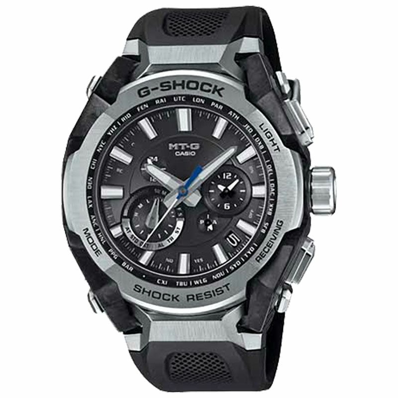 G-SHOCKの起源である樹脂素材とメタル素材を融合して、革新的な構造美を追求するMT-Gシリーズ。MTG-B4000は、蓄積された耐衝撃データを活用したAIによって開発されたデュアルコアガード構造と、カーボンとステンレススチールの異素材融合フレームを採用しています。カーボン積層フレームは、シート状のカーボンとグラスファイバーを積層した母材を立体状に削り出し複雑造形のフレームを成形。ベゼルのステンレススチールパーツは内側と外側で2体ベゼルを採用。ヘアライン仕上げとミラー仕上げで部位ごとに磨き分け、美しく仕上げました。裏蓋は、粉末状の金属を射出成形するMIM(メタルインジェクションモールディング)成形により立体的に成形され、ケースを保護しています。機能面ではBluetooth? 通信機能により専用アプリ「CASIO WATCHES」と接続し時刻情報を取得。マルチバンド6やタフソーラー、高輝度なLEDライトも搭載し、実用的な機能を備えています。