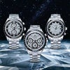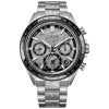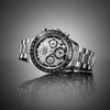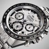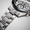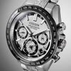 シチズン独自の技術で開発した結晶チタニウムを中駒に採用。デュラテクトプラチナを重ねることで結晶模様がプラチナの輝きをまとい、存在感を放ちます。シルバーの文字板は、結晶チタニウムをイメージしたデザインで、光に反射して表情を変えるメタリック塗装をプラス。見返しリングにも同様にメタリック塗装を施すことで、文字板や外装との一体感を演出しました。