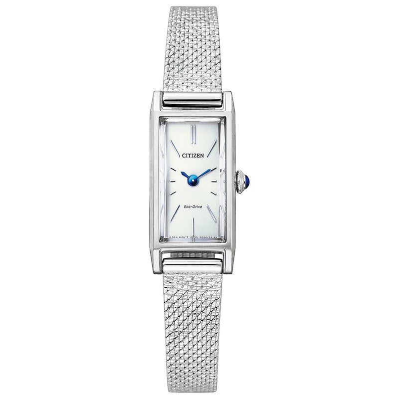 クラシカルな雰囲気をより一層高める風合いのあるパターンが施されたメッシュバンド。ハンサムな印象の長角ケースにカーブガラスを合わせた、オーセンティックなデザイン。幅広い年代の方に愛される1本です。文字板はすっきりとした印象のバーインデックス。小さいサイズながらも視認性の良さと機能性にこだわりました。
