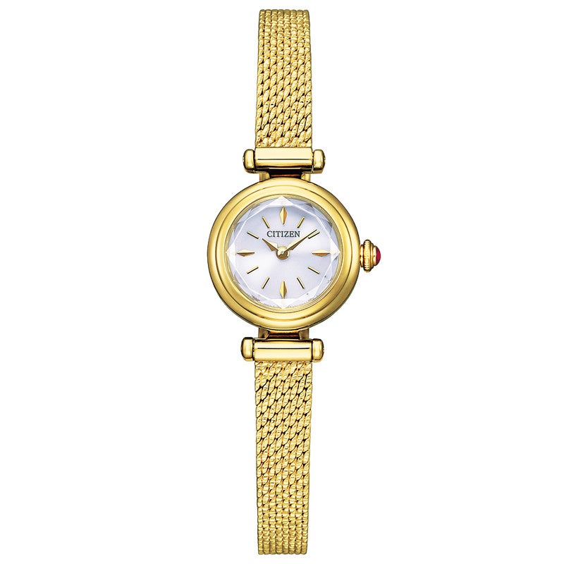 飾りピンに見立てたパーツやメッシュのバンドが、シックでアンティークなジュエリーのような表情を演出します。ガラスのアクセサリーボックスをイメージしたカットガラスが、キラキラ繊細に輝きます。りゅうずには、ケースにあわせたアクセントカラーをプラスしました。