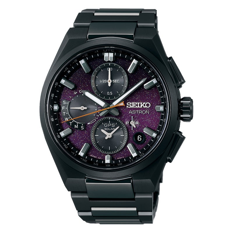 星空と風に舞う夜の桜が織りなす美しい情景を、オールブラックカラーのケース・ブレスレットと、パープルカラーをベースとしたラメ入りのグラデーションダイヤルで表現しています。