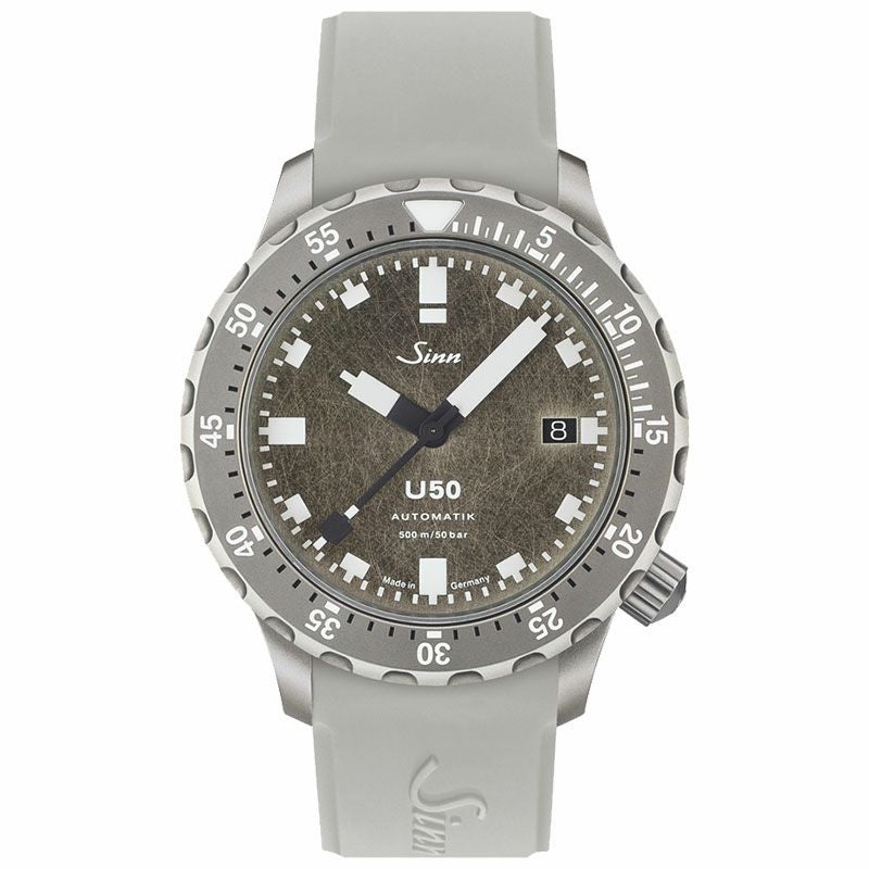 1,000本限定で製作されたU50.DSの特徴は、1点1点手作業によりスクラッチ加工されたダイヤルです。この加工は二度と同じ外観は再現されないため、それぞれの時計は唯一無二となります。不規則なパターンを持ちながら、ミニマルなダイヤルデザインのおかげで視認性を損なうことはありません。