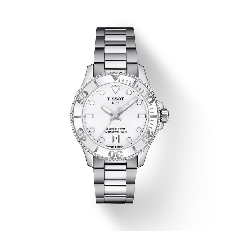 36mmのTISSOT シースター 1000は、存在感のある時計。都会のジャングルを平然と歩き、海の底に潜っても大丈夫な強さを備えています。